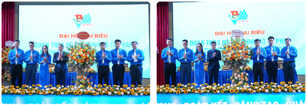Bộ trưởng Bộ Tư pháp Nguyễn Hải Ninh; Bí thư Đoàn Thanh niên Chính phủ Bùi Hoàng Tùng tặng hoa chúc mừng Đại hội.